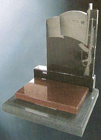 This grave memorial is priced with base size 10x10x4. Shown in G633 grey base , G654 grey top , and a brown granite bevel. Stenciled gun and chinese flag design.