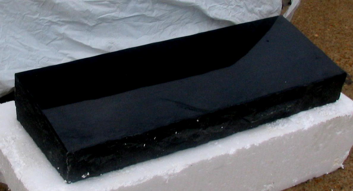 This bevel style cemetery headstone features a polished top with rough cut front, back, and sides and it measures 36 inches left to right, 12 inches top to bottom and 6 inches thick at the most wide point and 4.5 inches at the most narrow of the bevel. Priced to include basic engraving (up to 40 characters) and shipping directly to a commercial address with unloading capabilities within the Continental United States.