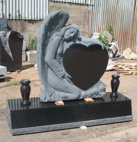 ![]() Engraved Angel Heart Headstone This is another completed angel heart headstone in solid black granite. This monument has been engraved with a traditional name and date epitaph and has further been personalized with a picture of the deceased. You can customize your headstone by choosing from our wide variety of designs and font styles. Email us today at chris@headstoensusa.com for your free proof and quote. | ![]() Black Granite Carved Angel Gravestone This is one of our completed black granite, carved angel gravestones. The pictured memorial has been laser etched with a picture of the deceased and customized with a personal epitaph on the base which reads, "One who has loved will continue to be loved." Email us today to cusotmize your gravestone. |