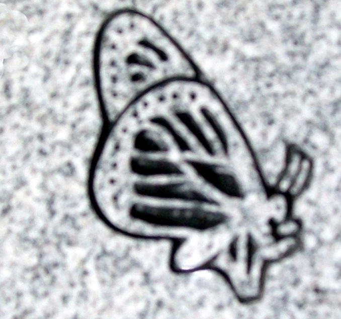 This delicate butterfly cemetery headstone design is a great way to add a feminine touch to any memorial or pay tribute to a nature lover or gardener. Shown here sandblasted on to our high quality solid gray granite and then enhanced by the addition of a black lithichrome stone paint.