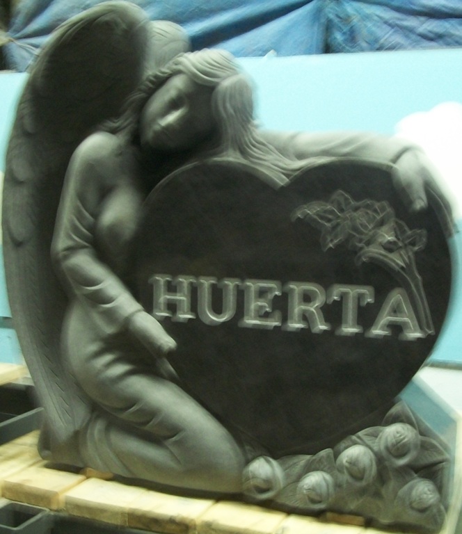 This is a Bahama Blue AN-O1, it's a Angel sculpture holding a heart monument. It is another variation of color of stone and sizes of lettering we can offer you! This one in particular was sand-blasted to it's proper depth and then painted white as the customer requested. It can also be painted different colors for free if you so desire.