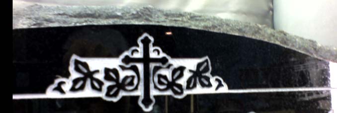 This awe-inspiring combination design features a delicate border that surrounds the headstone and a cross with a leaf garland at its base that adorns the top of the monument. As shown here on our high quality solid jet black granite and enhanced by the addition of an optional but free of charge white lithichrome stone paint this is the perfect way to memorialized your loved one with a custom design.