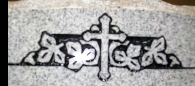 This beautiful combination border design features a cross with a leaf garland at its base and a border that extends around the edge of the entire headstone. Shown here on our high quality solid gray granite and highlighted by a black lithichrome stone paint.