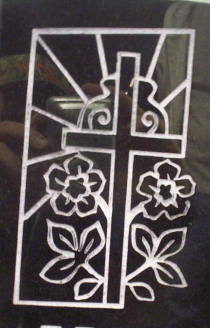 This Cemetery Headstone Design with a basic cross design surrounded by flowers is shown on Black Granite.