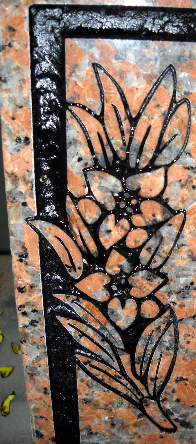 This absolutely stunning Cemetery Headstone Intricate Easter Lily Design is shown on an India Red Granite and enhanced by a black lithichrome stone paint. This design can be used with or without the border.