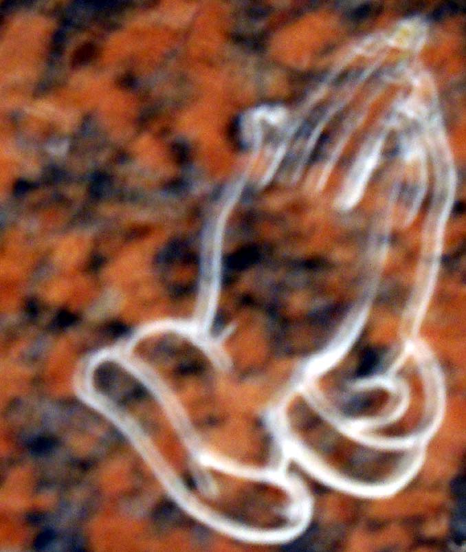 This Cemetery Headstone Praying Hands Design is shown on Marble Red Granite and enhanced by the addition of a white lithichrome stone paint.
