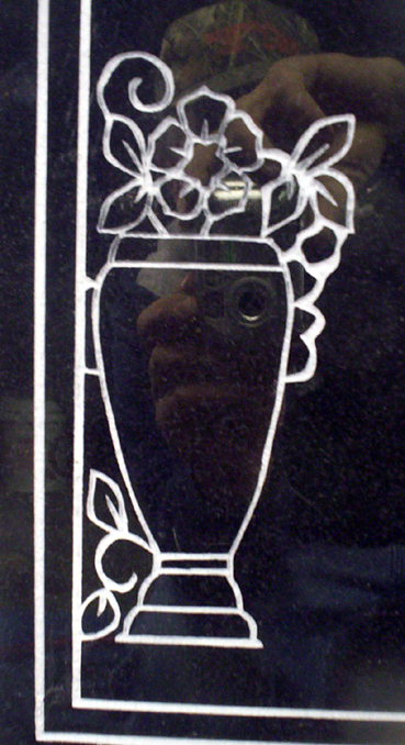 This elegant and eye-catching sandblasted vase of flowers design is shown on our high quality solid jet black granite cemetery headstone and is embellished by adding a white lithichrome stone paint.