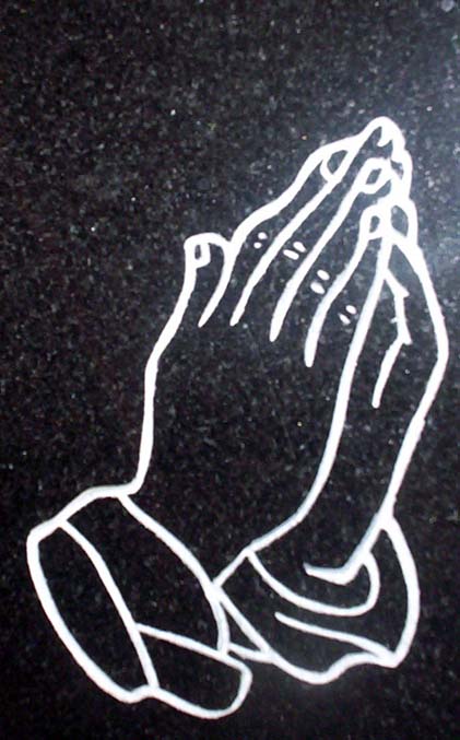 This Cemetery Marker Sandblasted Design is of praying hands on a Jet Black Granite and is enhanced by the addition of a white lithichrome stone paint.