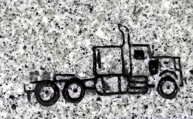 This unique big 18 wheeler truck design is a great way to pay tribute to that special truck driver in your life. Shown here the engraved design is shown on our high quality solid gray granite and is enhanced by the addition of a black lithichrome stone paint which is an optional but free of charge service on all of our sandblasted designs.