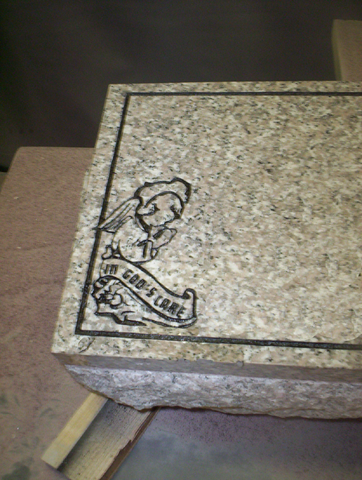 This High Quality solid granite Cemetery Memorial is shown with our "In God's Care Angel with Border Design" all of which is highlighted with a black lithichrome stone paint for emphasis.