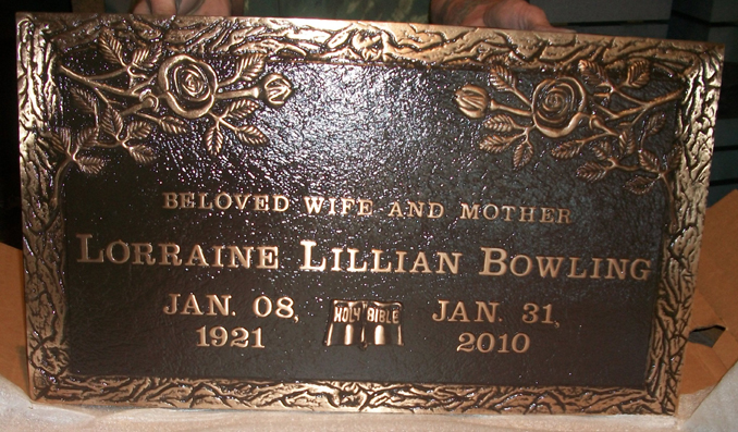 This beautiful rose design style bronze plaque is shown here completed with the traditional name and dates with the addition of a Holy Bible design as well as the touching epitaph "Beloved Wife and Mother"(both of which incur additional cost). Custom designs and or epitaphs can be added to bronze plaques upon request. Contact us today for a price quote and assistance in selecting the perfect memorial.