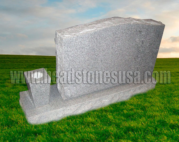 This gravestone features a top that is polished on the front and back with rough cut sides and top that measures 36 inches left to right x 6 inches thick x 22 inches tall with a base that measures 48 inches left to right x 12 inches wide x 6 inches thick with a polished top and rough cut front, back, and sides. This model is priced to include one tapered style vase (as shown).