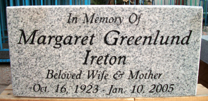 This high quality solid Gray Granite memorial grass marker features the traditional name and dates along with the tributes of "In Loving Memory Of", "Beloved Wife and Mother" all sandblasted and then enhanced by the addition of a black lithichrome stone paint.