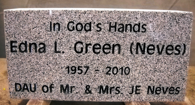This engraved 16x8x4 gray granite gravestone features the traditional name and dates along with a religious epitaph that reads, "In God's Hands" and lets the world and future generations know the devout nature of this loved one. The characters are sandblasted and enhanced by the addition of a black lithichrome stone paint.