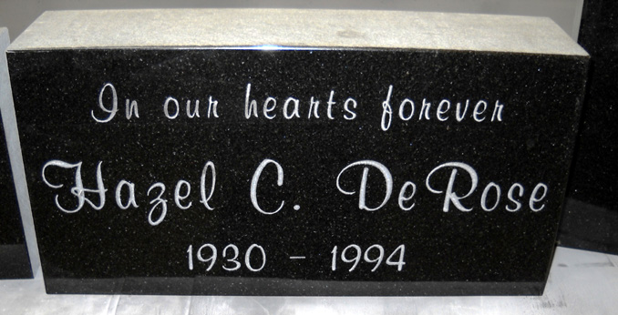 This engraved jet black funeral monument is designed as a companion monument to match another memorial with exactly the same font and poignant epitaph of "In Our Hearts Forever" and the basic engraving and enhanced by a white lithichrome stone paint. We provide exceptional customer service and work with you to create the perfect tribute to your loved one. So, whether you would like something simple or elaborate we will work with you to create it.