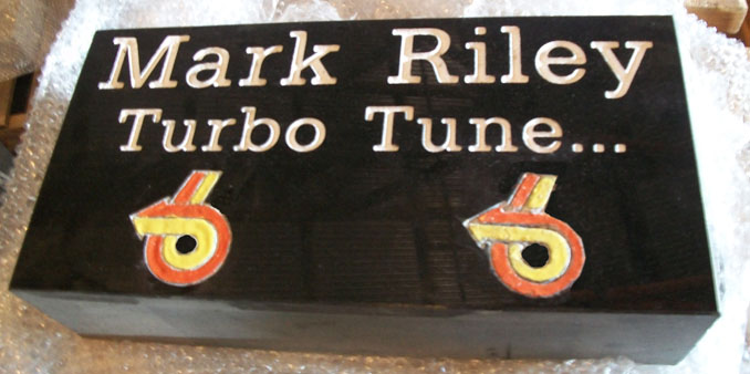This versatile flat 16x8x4 granite is traditionally used as a memorial marker in a cemetery but can also be used as a sign for a business as shown here sandblasted into our high quality solid jet black granite with custom designs that are highlighted by the addition of both and orange and yellow lithichrome stone paint (white or black paint are free but colored paints will incur additional charges).