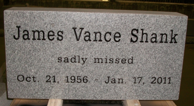 This simple memorial is shown here sandblasted into our high quality solid Georgia Gray Granite and features the traditional name and dates as well as a custom epitaph all of which have been enhanced by the addition of a black lithichrome stone paint.