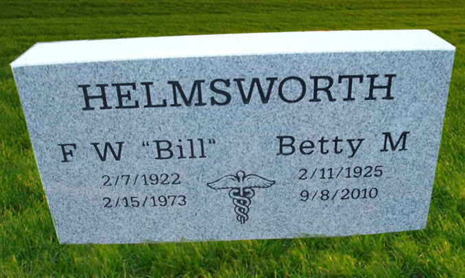 This companion monument features the surname across the top in a bold font style followed by two individual name and dates with the Medical Caduceus Symbol Headstone Design 703 in the center, all of which is sandblasted and then enhanced by the addition of a black lithichrome stone paint.