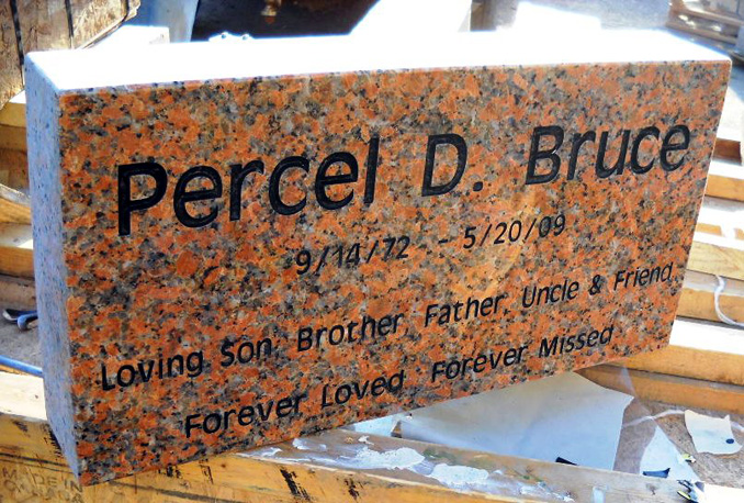 This engraved high quality solid granite marble red cemetery monument is shown here with the traditional name and dates as well as the touching epitaphs, "Forever Loved, Forever Missed" and "Loving Son, Brother, Father, Uncle, and Friend" all sandblasted and enhanced by the addition of a black lithichrome stone paint.