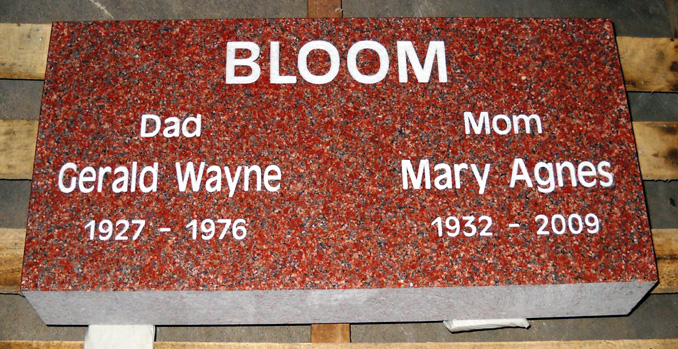 This engraved 24x12x4 funeral marker is shown here in our high quality solid India Red granite and being used as a companion monument with the surname in large characters across the top, the epitaphs, "Mom", "Dad", and two individual names and dates below all sandblasted and enhanced by the addition of a white lithichrome stone paint.