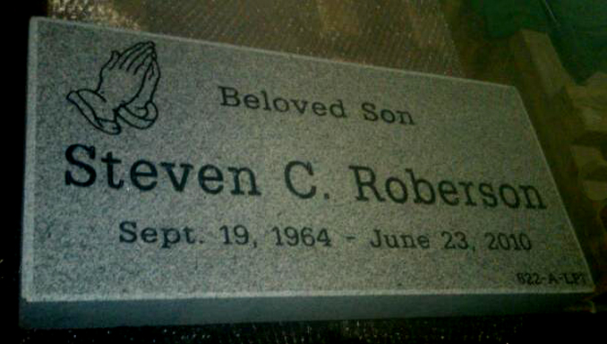 This religiously themed tribute to a "beloved son" features the traditional name as dates as well as our Praying Hands cemetery headstone design D-58 shown here sandblasted into our high quality solid G633 Gray Granite and then enhanced by the addition of a black lithichrome stone paint. This memorial also features a double-processed border style epitaph box (which is available upon request but incurs additional cost).