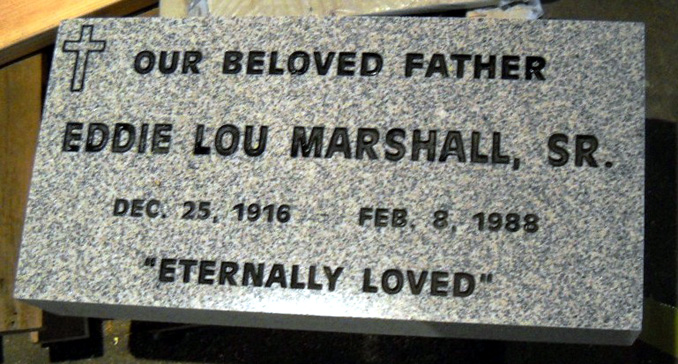 This engraved high quality solid G633 gray granite memorial is shown here completed with our basic cross design D-25 and the epitaphs "Our Beloved Father", and "Eternally Loved" all sandblasted and enhanced by the addition of a white lithichrome stone paint.