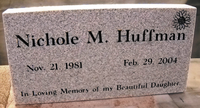 This engraved 24x12x3 Georgia Gray Funeral Memorial is a warm and loving tribute to a life cut short and features our beautiful sunflower design 1219 which symbolizes loyalty, adoration, warmth and longevity along with the traditional name and dates as well as the heart breaking custom epitaph, "In Loving Memory of my Beautiful Daughter" all sandblasted and enhanced by the addition of a black lithichrome stone paint.