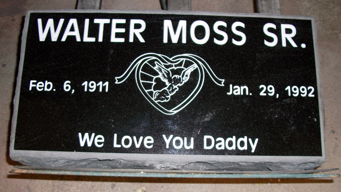 This engraved jet black high quality solid granite funeral memorial marker is shown complete with our angel design 133, basic engraving, and the endearing epitaph "We Love You Daddy" all enhanced by the addition of a white lithichrome stone paint.