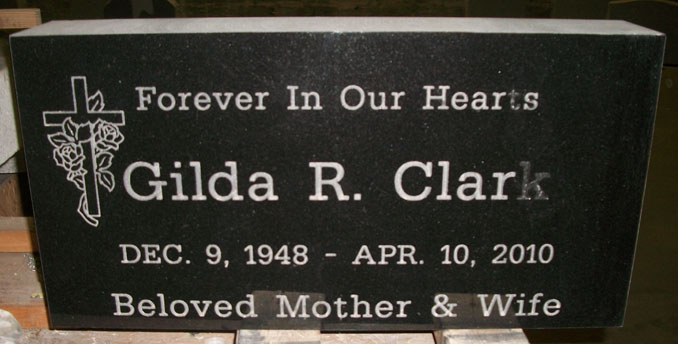 This memorial to a "Beloved Mother and Wife" features our cross and floral cemetery headstone design D-18 as well as a n epitaph and the traditional name and dates shown here engraved into our high quality solid Jet Black Granite without lithichrome stone paint. (The addition of lithichrome stone paint is a free of charge service available upon request).