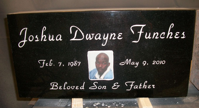 This traditional engraved jet black headstone features the name, dates, and "Beloved Son and Father" epitaph completed our Murray Hill Bold Font style (just one of our over 1000 font styles)and enhanced by the addition of a rectangle ceramic photo (just one of our many sizes and shapes of ceramic photos). For more information on ceramic photos click on the link in the information center or contact us today.
