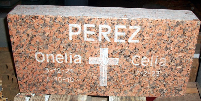 This companion funeral memorial is shown here completed on our high quality solid Marble Red Granite and features the surname in large characters across the top, followed by the traditional two individual name and dates with our reverent and serene cross and rosary headstone design 599 resting in between the two names and dates, all of which are sandblasted and then enhanced by the addition of a white lithichrome stone paint.