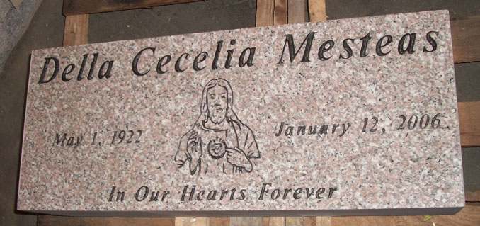 This religiously themed cemetery marker pays tribute to the devotion of the deceased to their faith with the D-14 Sacred Heart of Jesus Design and a custom epitaph, "In our Hearts Forever" along with the traditional name and dates all of which was sandblasted into our high quality solid Anxi Granite and then enhanced by the addition of a black lithichrome stone paint.