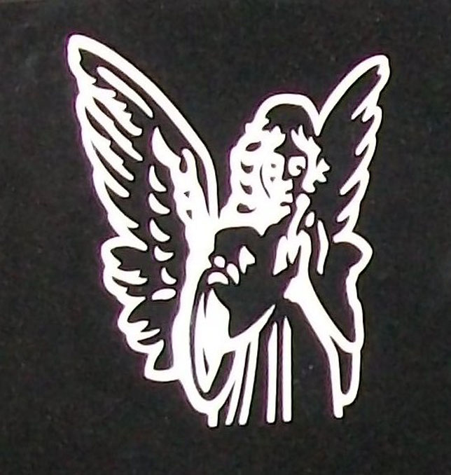 This celestial cemetery headstone design 122 features a beautiful angel with intricately detailed wings and clasped hands shown here sandblasted on to our high quality solid Jet Black Granite and then enhanced by the addition of a white lithichrome stone paint.