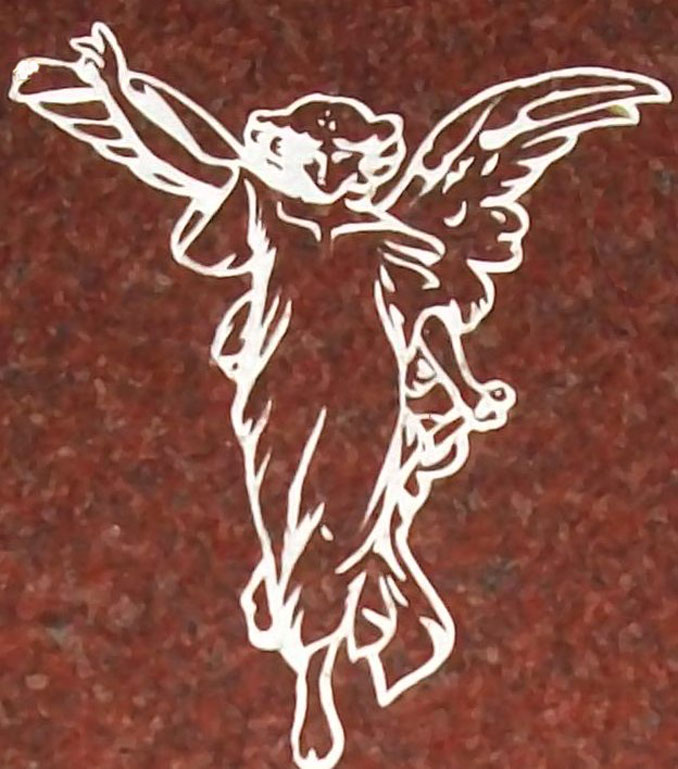 This beautiful angel headstone design features an angel in flight with its arms raised to praise God. A great choice to adorn any memorial you choose to pay tribute to your loved ones dedication to their faith. Shown here sandblasted into our high quality solid India Red Granite and then enhanced by the addition of a white lithichrome stone paint.