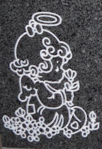 This enchanting Precious Moments style child-like angel cemetery memorial design 165 is shown here sandblasted onto our high quality solid G654 Dark Grey Granite and enhanced by the addition of a white lithichrome stone paint.