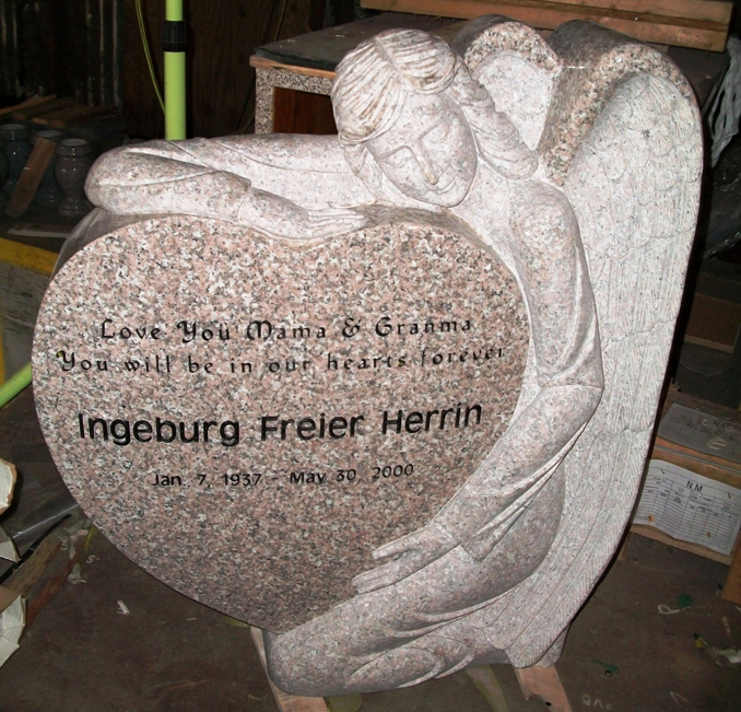 This beautiful memorial features an intricately detailed angel embracing a heart with plenty of room for personalization as shown here.