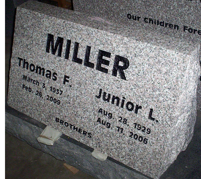 This versatile 30x10x16 inch memorial is large enough to be used as a single monument or as a companion headstone as shown. The surname adorns the top and the two individual names along with the title of "brothers" at the bottom were all completed in an antique olive bold font and highlighted by a black lithichrome stone paint. A great way to accessorize this already impressive tombstone would be to add a ceramic photo of the two brothers together for the available sizes and a price guide the links or contact us for more information.