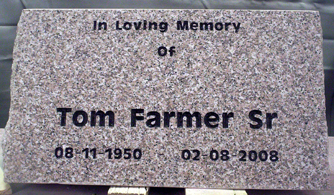 This simple but noteworthy slant style memorial is shown with only the basic name and dates along with the tribute of "In Loving Memory" all sandblasted in an antique olive bold font and highlighted by a black lithichrome stone paint for emphasis. A great and inexpensive option to further customize this headstone would be to add a sandblasted design that symbolizes your loved one. A cross, a fishing pole, a tractor, a flower, or anything that personalizes the tombstone. We offer a wide variety of standard designs and always welcome designs or your original creation. To view our selection click on the link or call us for pricing and or information.