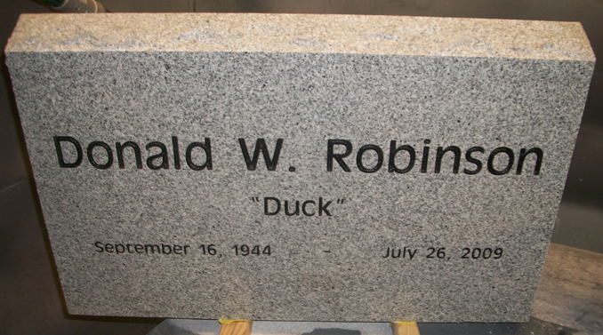 This simple memorial features the traditional name and dates and is shown here sandblasted on to our high quality solid SP8 P1 Gray granite slant and then enhanced by the addition of a black lithichrome stone paint.
