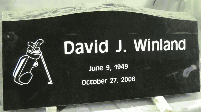 This custom designed headstone features a standard epitaph engraved into an antique olive medium font highlighted by white lithichrome stone paint. The design to the left is just one of our 1000's of standard designs yet it personalizes this stone and celebrates the life of your loved one just as you would have them be remembered. A golf bag is featured but we have other sports as well. Click on the link or contact us for price quotes on a design of your creation or questions concerning engraved designs.