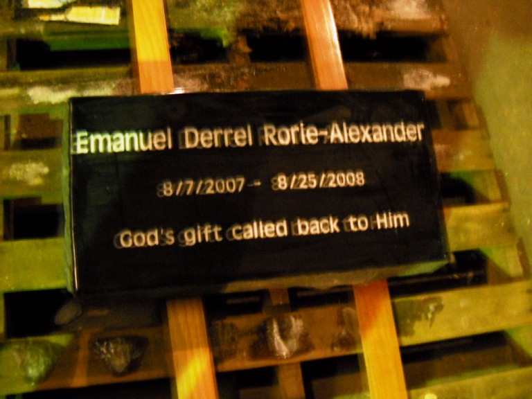 This basic high quality solid jet black bevel style memorial is shown being used for an infant monument. The tribute of "God's gift called back to him" along with the basic epitaph were completed in antique olive medium font style highlighted by a white lithichrome stone paint.