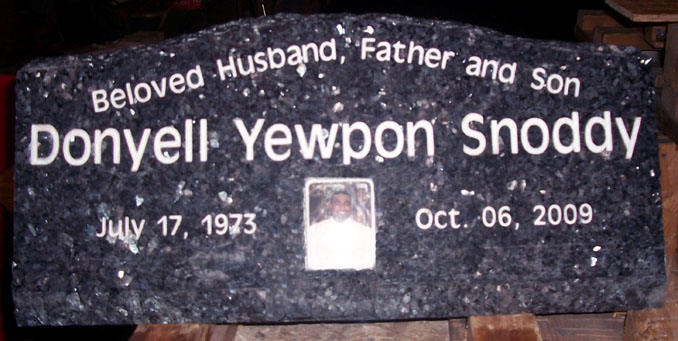 This heart-breaking tribute to a life cut short features the custom epitaph, "Beloved Husband, Father, and Son" along with the traditional name and dates all shown here sandblasted on to our stunning high quality solid Blue Pearl Granite and then enhanced by the addition of a white lithichrome stone paint. The memorial also features a rectangle ceramic photo of the deceased, which is just one of our many sizes and styles. For more information on porcelain portraits or how to customize the perfect tribute to your loved one contact us today.