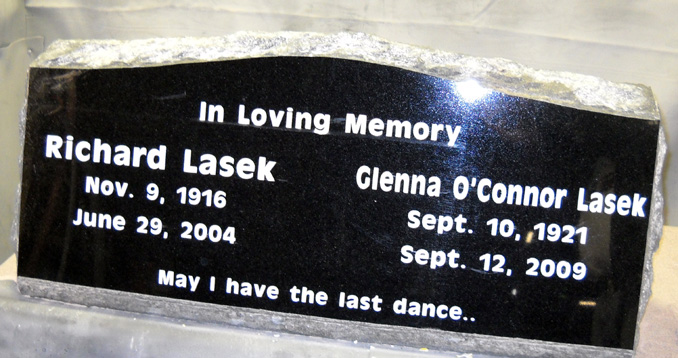 This large yet versatile 36x10x14 headstone is the perfect size to be used as a double headstone or companion monument. As shown there is plenty of room for a family name and double epitaph. The unique "May I have the last dance" epitaph along with the traditional names and dates have been engraved using the antique olive bold font highlighted by white lithichrome stone paint for emphasis. We have over 1000 fonts available for you to choose from so we are sure to have just the right one to celebrate the life of your loved one.