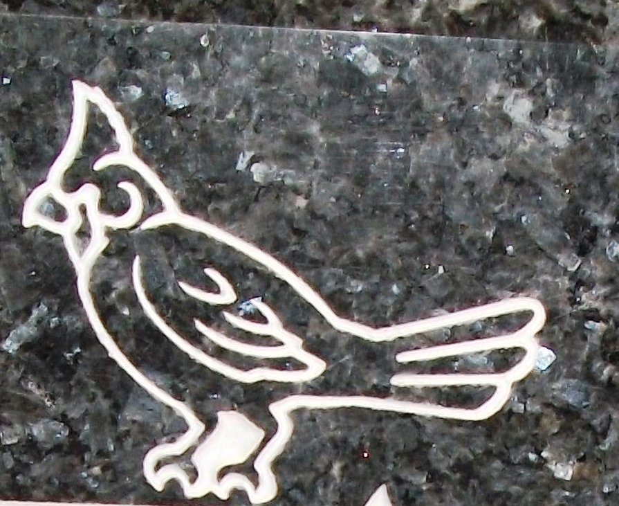 This engraved Cardinal Design 195 is shown on our high quality solid Blue Pearl Granite and is then enhanced by the addition of a white lithichrome stone paint