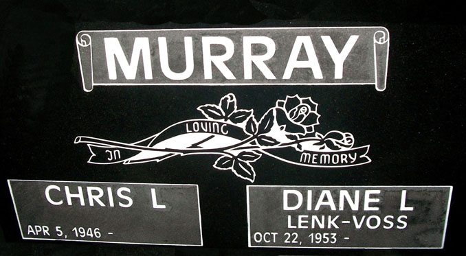 This inclusive design features a scroll style epitaph box perfect for use with a surname (as shown) followed by a pair of roses intertwined with a ribbon that reads, "In Loving Memory" and two individual basic epitaph boxes. Perfect for use as a companion memorial design. Shown here sandblasted on our high quality solid jet black granite and then enhanced by the addition of a white lithichrome stone paint. The center of the epitaph boxes has been double processed (an optional service available upon request that incurs additional cost).