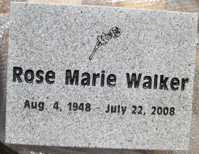 This simple yet charming cemetery marker is shown with the basic epitaph completed in an antique olive bold font and highlighted by a black lithichrome stone paint for emphasis both of which are free of charge services. The addition of a sandblasted rose to the top of the monument incurs an additional charge but really adds a feminine touch to the memorial. Sandblasted designs are surprisingly affordable. To view our selection of standard designs and a price guide click on the link or contact us for more information.
