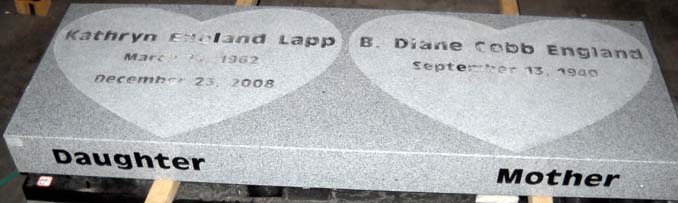 This touching mother/daughter companion memorial bench is shown highly customized by adding two double processed heart shaped epitaph boxes on the top of the bench completed by sandblasting the individual epitaphs into an antique olive bold font style and highlighting the characters with a black lithichrome stone paint.