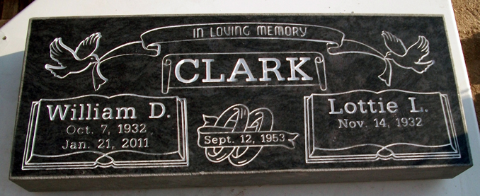 This beautiful tribute features a pair of doves holding a banner that reads "In Loving Memory followed by the surname and two individual open book style epitaph boxes with the traditional name and dates with a pair of wedding bands resting between the epitaph boxes engraved with the wedding date. A great choice for a companion memorial. Shown here sandblasted into our rare high quality solid Bahama Blue Granite and then enhanced by the addition of a white lithchrome stone paint.