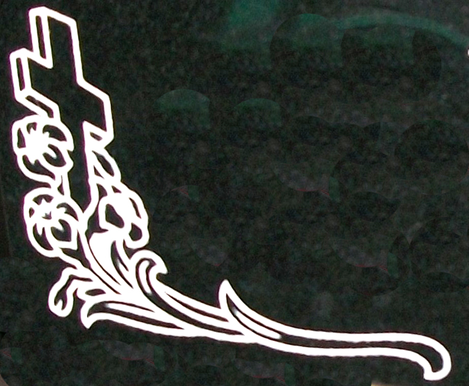 This simple yet beautiful three dimensional cross is surrounded at its base by delicate lilies. Shown here sandblasted into our high quality solid Jet Black Granite and then enhanced by the addition of a white lithichrome stone paint.