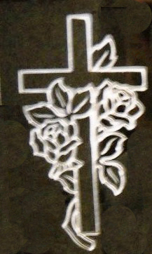 This beautiful basic cross and roses funeral monument design D-18 is shown here completed on our high quality solid jet black granite and is enhanced by the addition of a white lithichrome stone paint